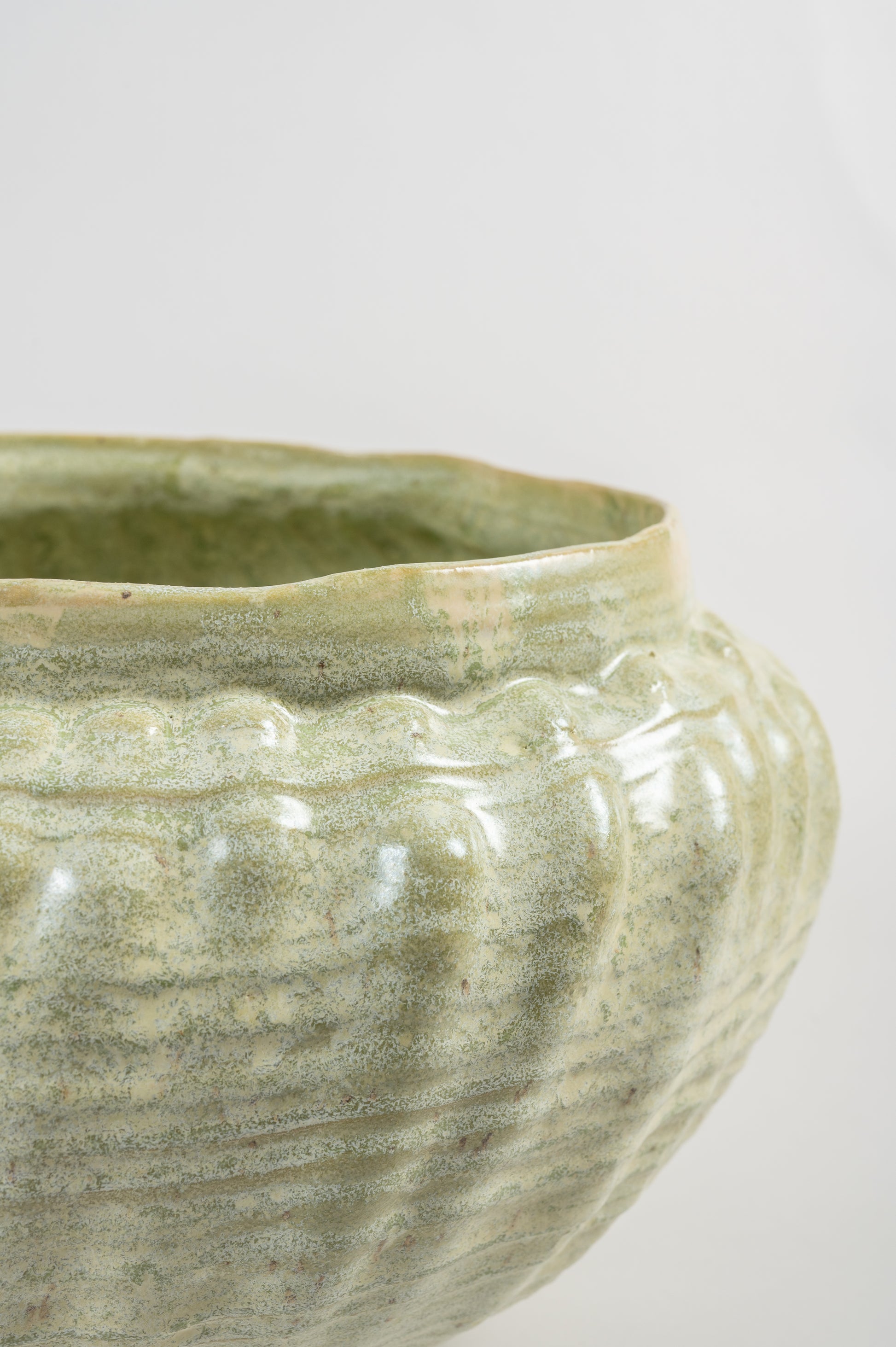 Thrown on the potter’s wheel and later hand-altered, this light green stoneware vessel draws inspiration from marine life—particularly the soft, organic forms of jellyfish. Its amorphic silhouette seems to float in space, evoking a sense of movement, fluidity, and connection to the timeless rhythm of the sea.
