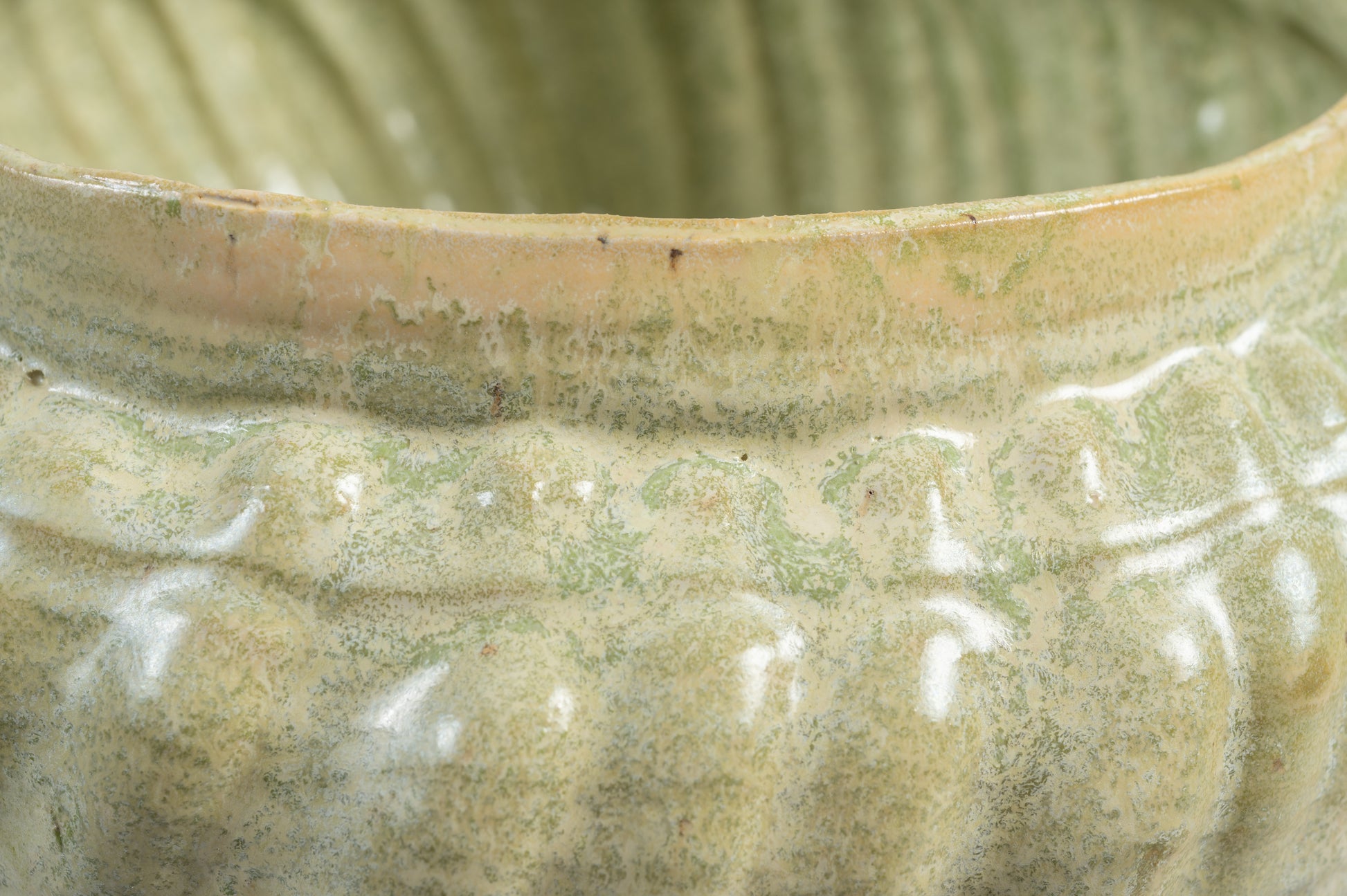 The crystalline glaze features layered shades of greens, accented by subtle hues of light greens, and browns. This interplay of colors gives the surface visual depth, warmth, and a dynamic, almost iridescent quality. As light shifts, so too does the character of the piece—revealing new tones and textures.