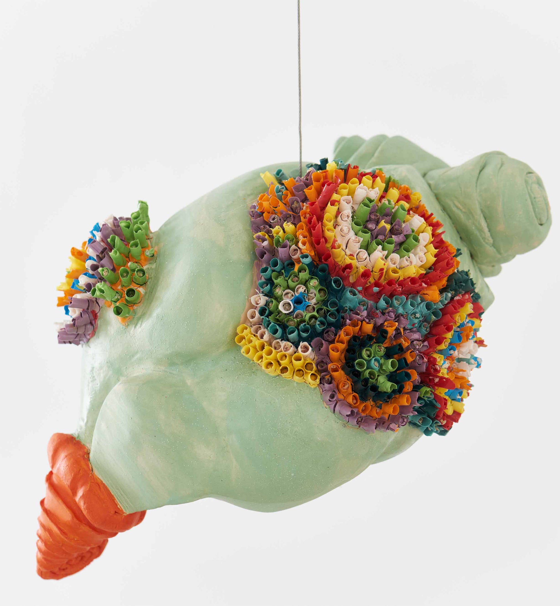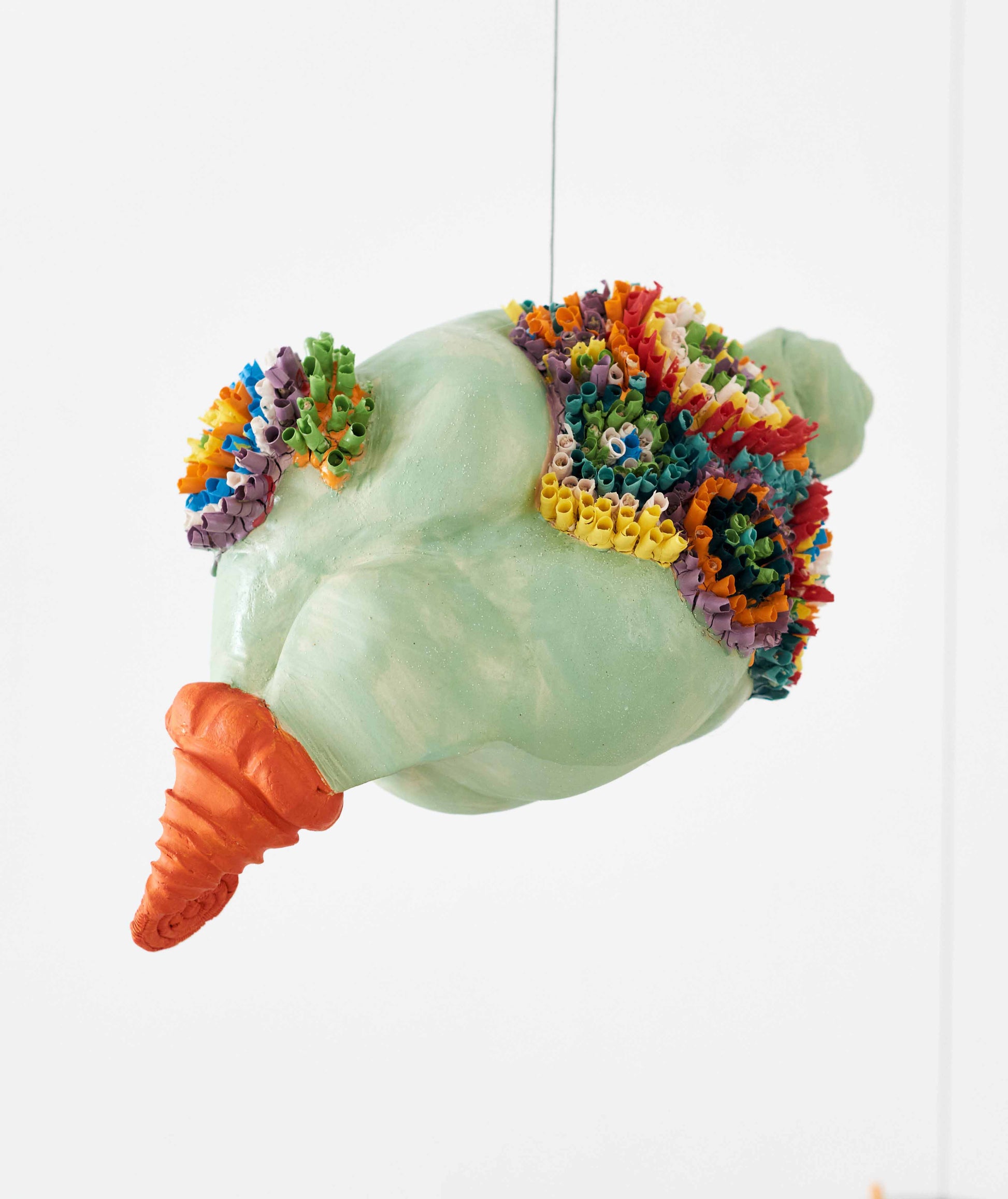 The Chameleon is an exquisite piece from Jacaranda Kori's thought-provoking installation, "Becoming Plastic," featured in her solo exhibition curated by Dr. Ayelet Zohar. This unique ceramic sculpture imitates the lightweight and playful appearance of a traditional piñata, yet it is skillfully crafted entirely from ceramic, challenging perceptions of materiality and texture.