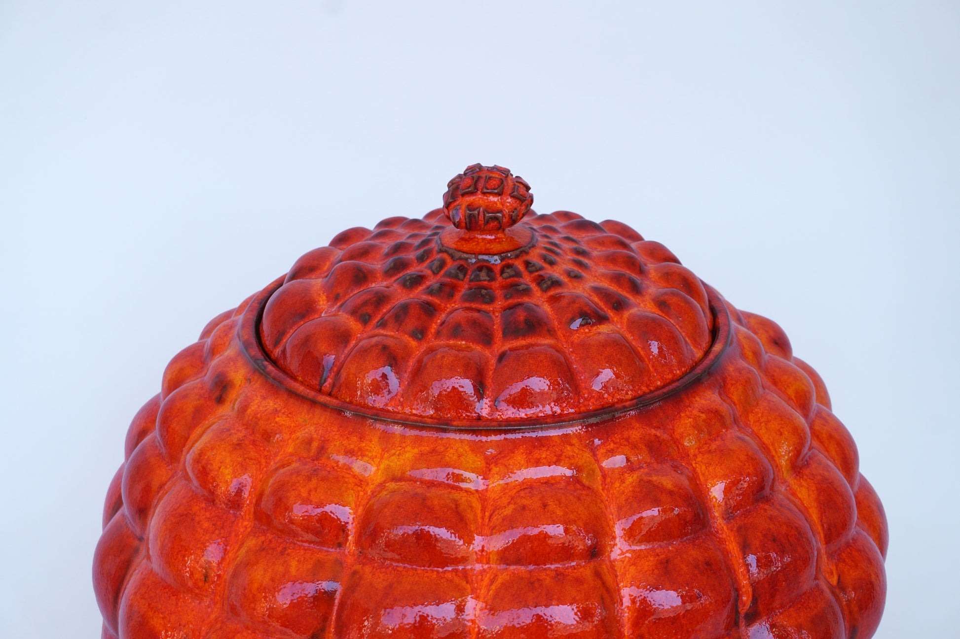 As one of the most powerful shades in color psychology, orange-red entices a wide range of emotions such as passion, excitement, and ambition. It's ability to trigger energy makes it an ideal option for creative spaces like home offices and studios. This hand-made Big Orange- Red vessel is crafted from fired earthenware ceramic, carefully shaped on the potter’s wheel and altered to create its sinuous curved lines and unique square grid texture. Its rich, red hue is sure to bring warmth and elegance to any home. The lid perfectly completes the piece, adding an extra level of sophistication to your décor.