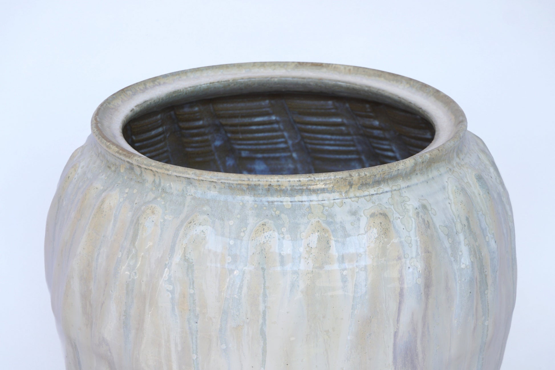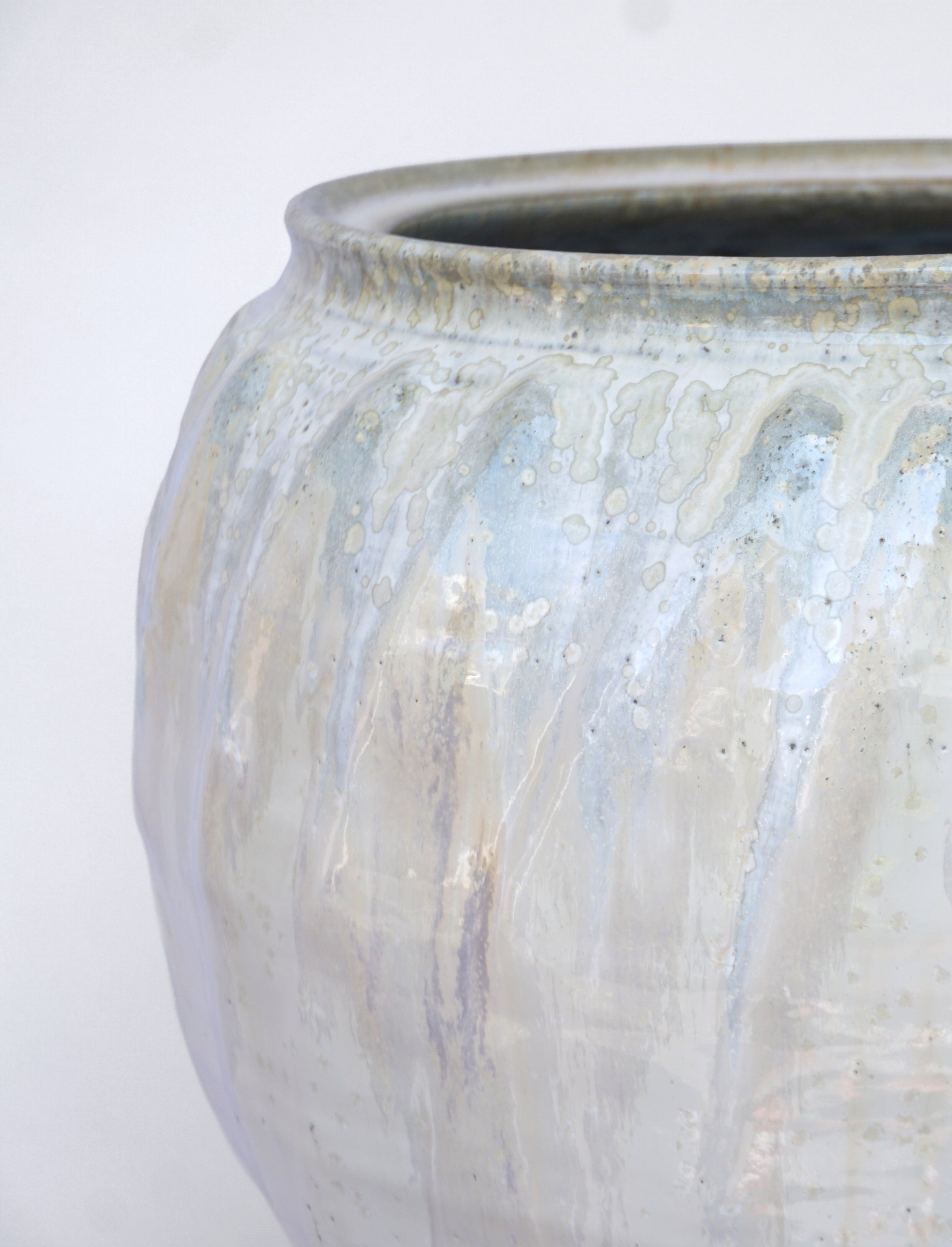 This stunning, handmade planter is crafted on the potter’s wheel and then altered to create a rich, textured surface that echoes the passage of time. Fired at 1200°C, it boasts high quality and exceptional strength. Its beige color results from multiple glaze layers, producing a subtle spectrum of grey and beige tones, enhanced by striking glaze crystals.